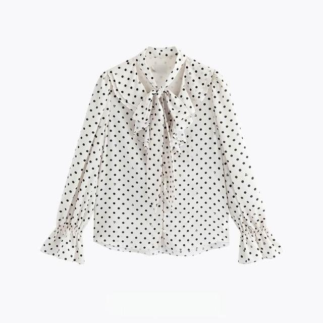2025新款法式蝴蝶結飄帶波點卡圓點襯衫女秋季長袖氣質緞面上衣