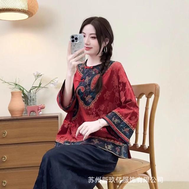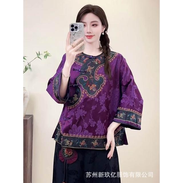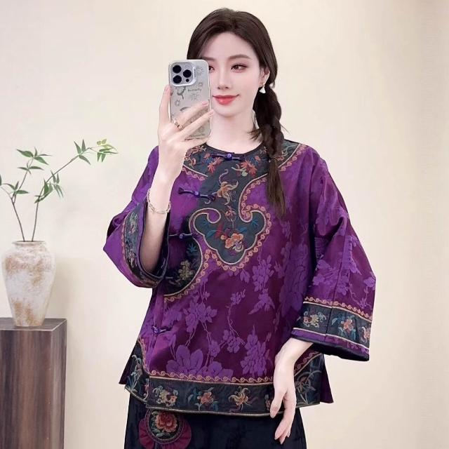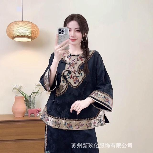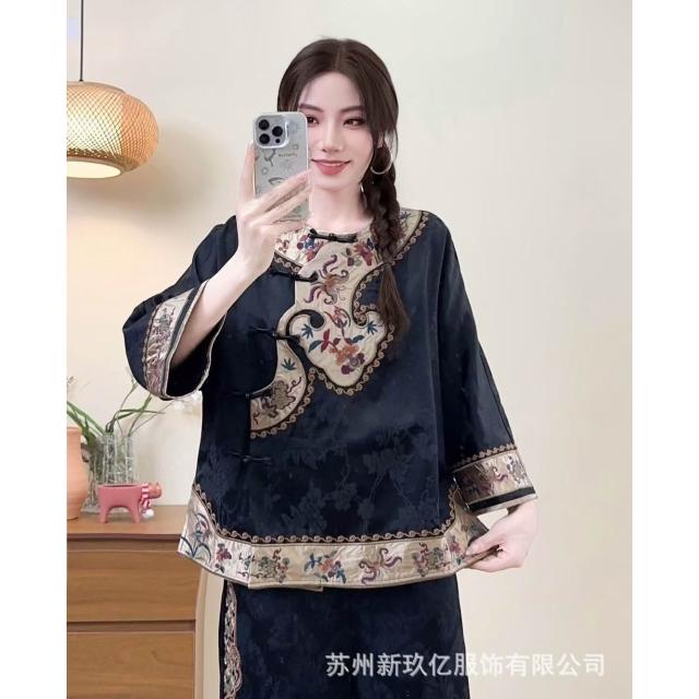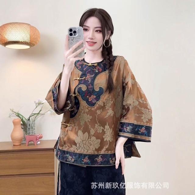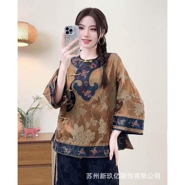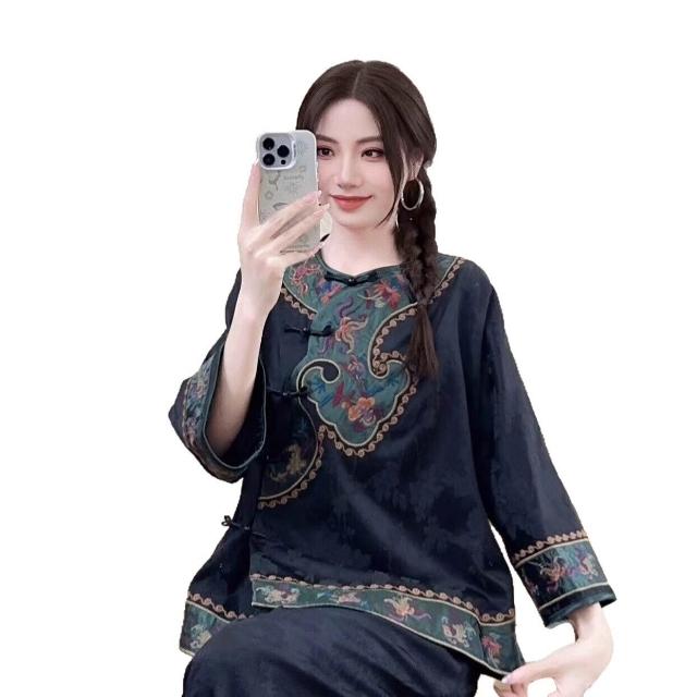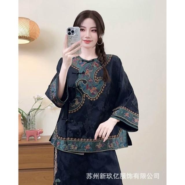 2025新款新中式文藝國風緞面人絲襯衫女民族風刺繡盤扣襯衫