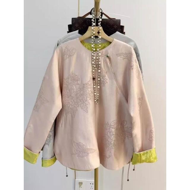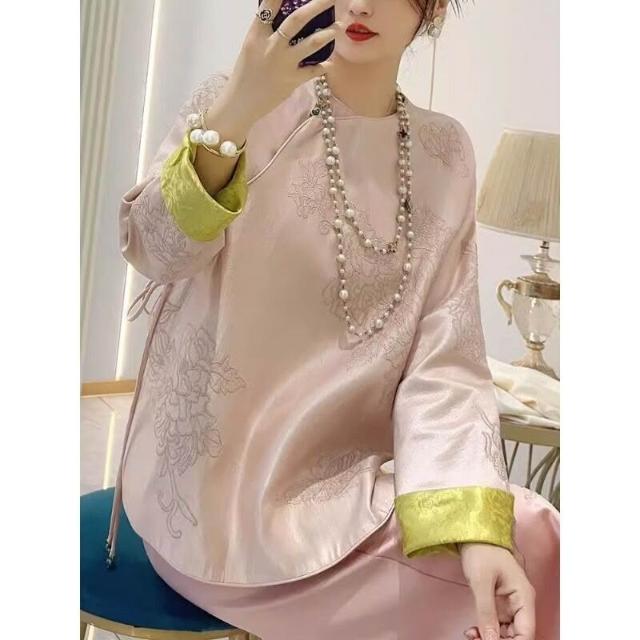 新中式改良唐裝緞面襯衫女秋冬新款國風重工刺繡斜襟連肩上衣外套