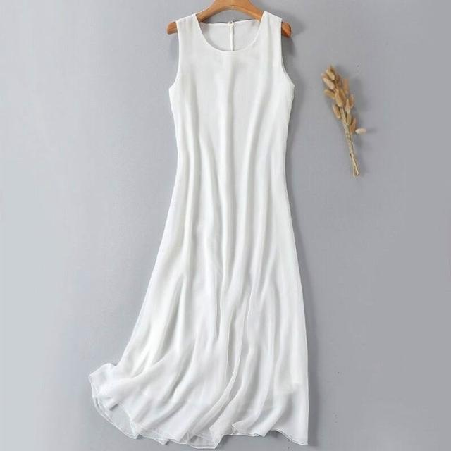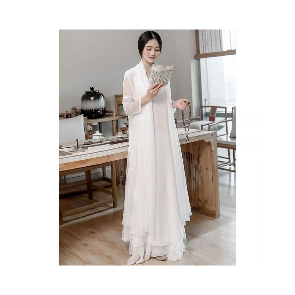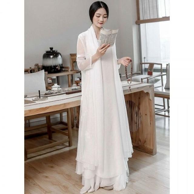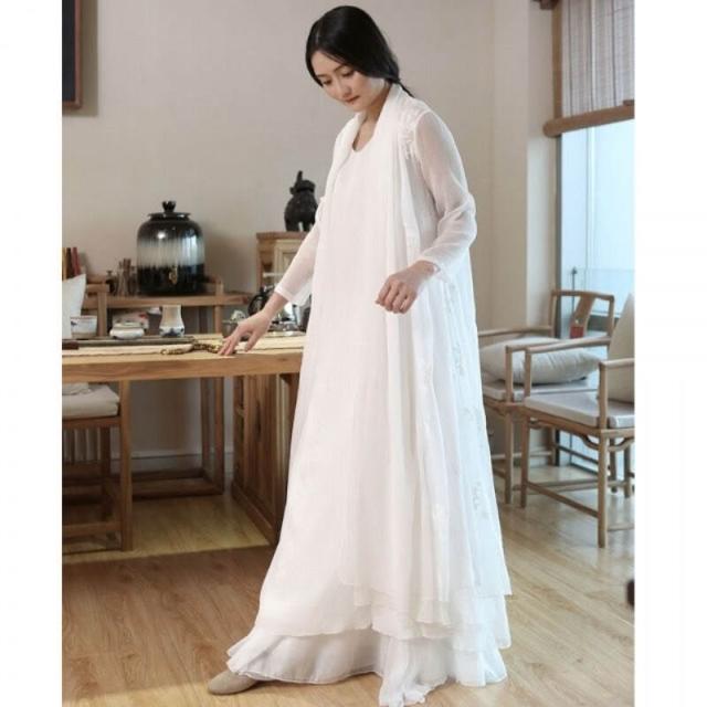 禅意茶服白色漢服連衣裙中國風女套裝禅修真絲皺披肩兩件套夏