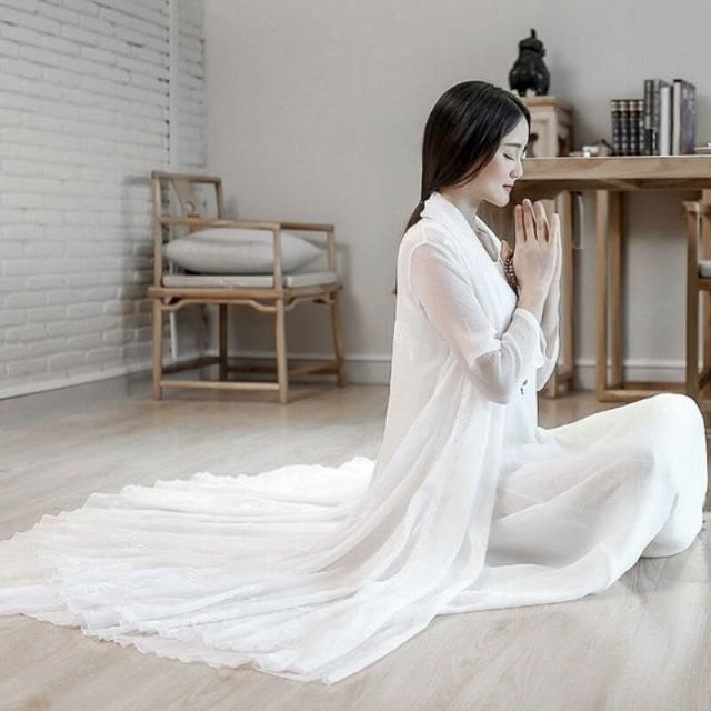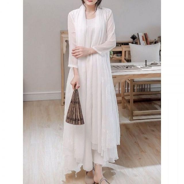 禅意茶服白色漢服連衣裙中國風女套裝禅修真絲皺披肩兩件套夏