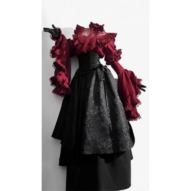 暗黑哥特風lolita襯衫魚骨半身裙姬袖套裝洛麗塔優雅華麗兩件套女