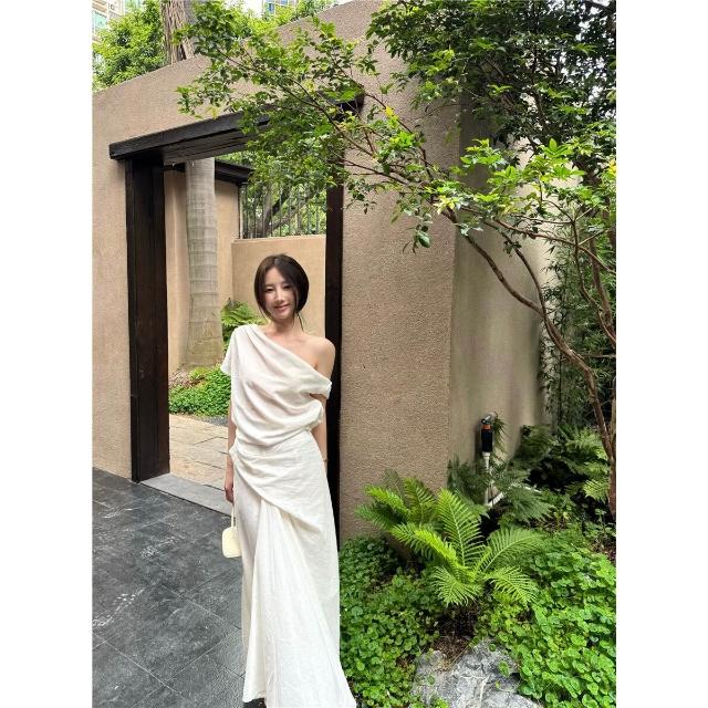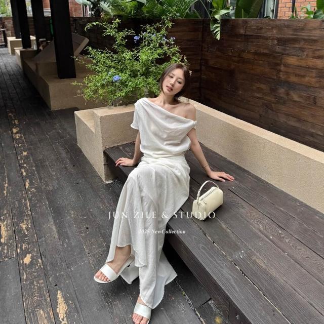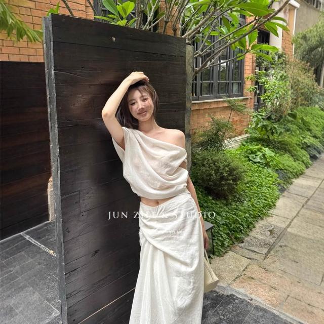 女士套裝氣質斜肩上衣不規則白色半身裙長裙夏季慵懶松弛感兩件套
