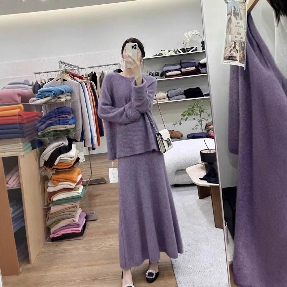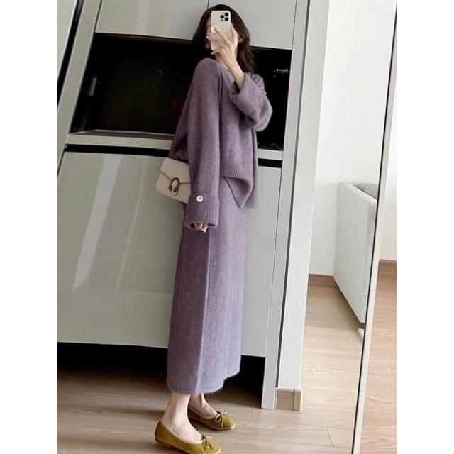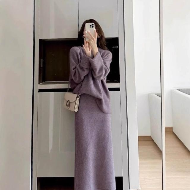 溫柔風紫色針織毛衣兩件套秋冬慵懶風圓領套頭上衣女高腰半身長裙