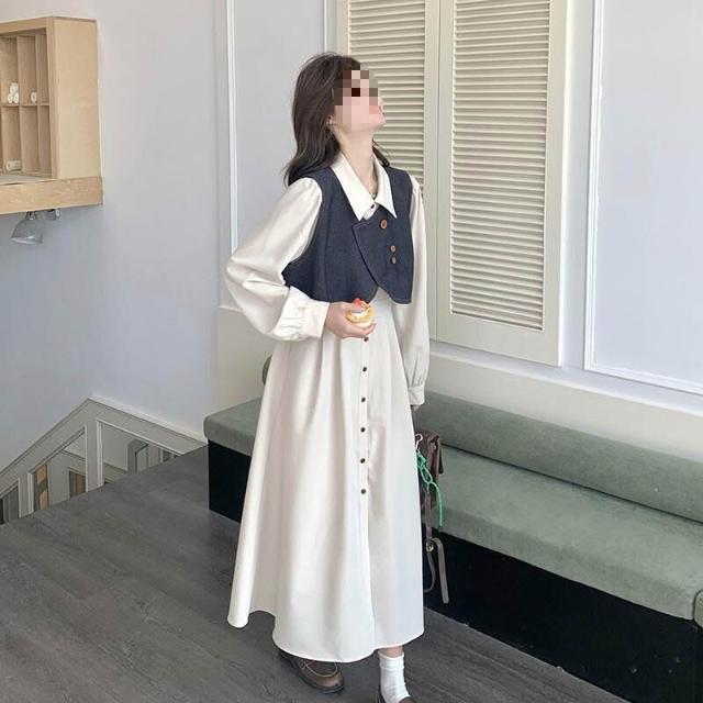 米白色法式襯衫連衣裙套裝女2025春季新款溫柔牛仔馬甲長裙兩件套