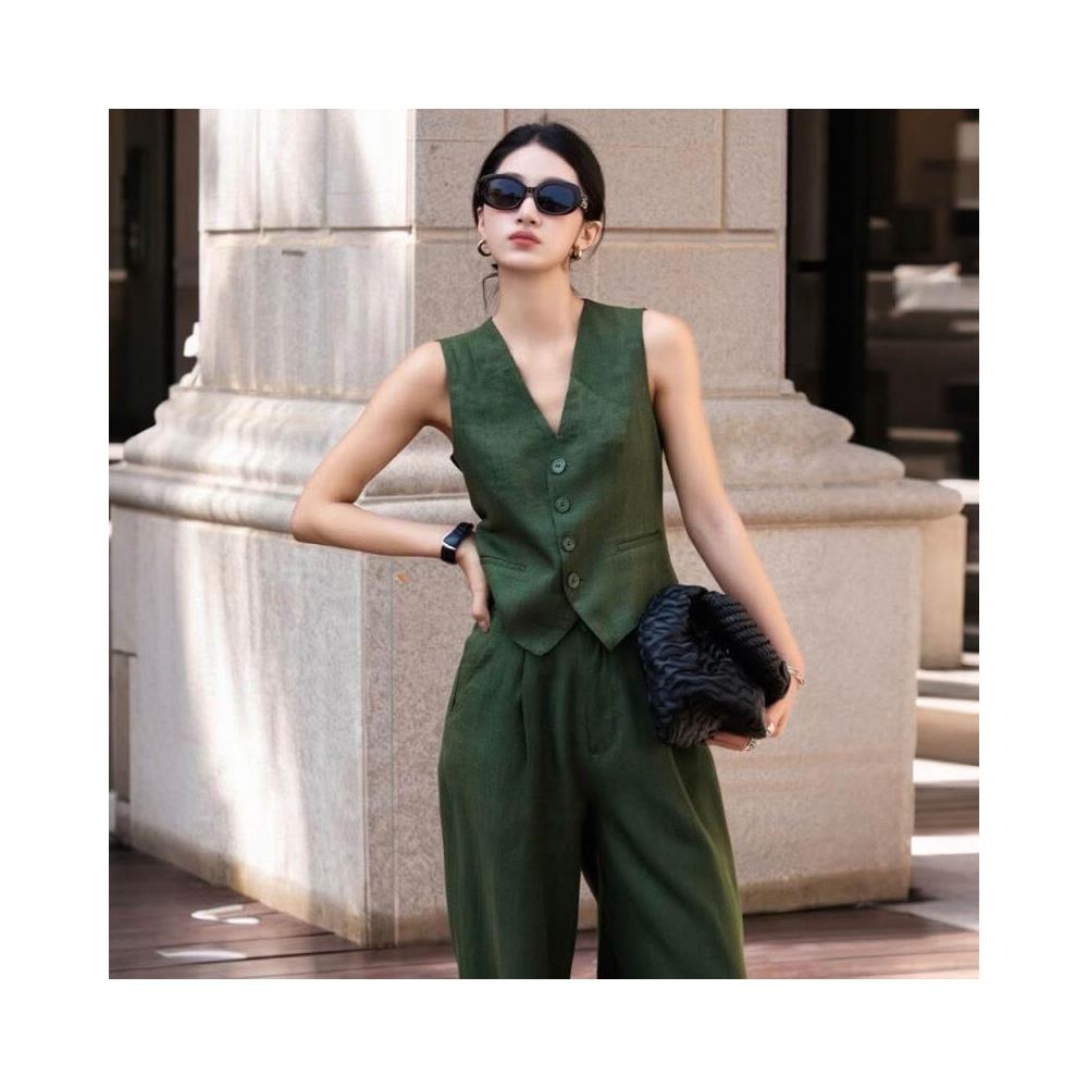 2025夏季新款綠色套裝女高端氣質度假老錢風馬甲闊腿褲兩件套