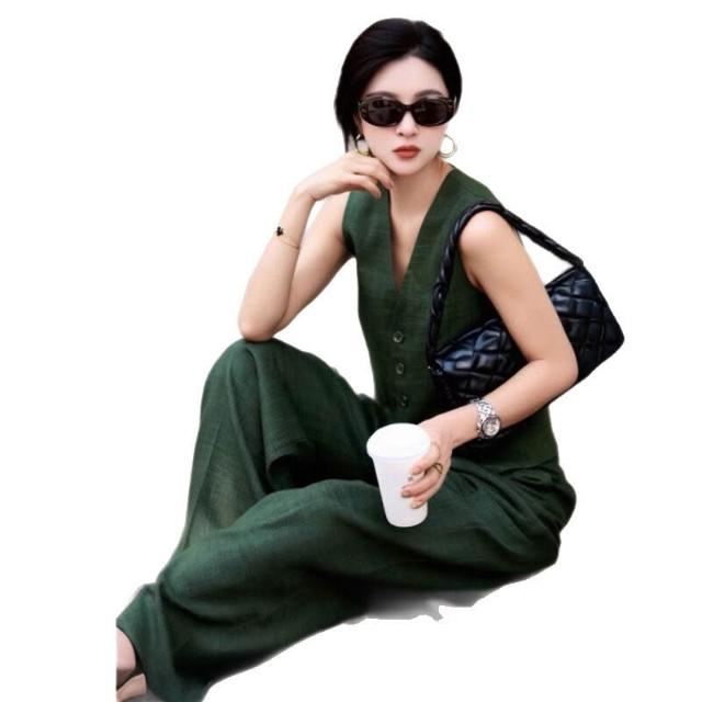 2025夏季新款綠色套裝女高端氣質度假老錢風馬甲闊腿褲兩件套