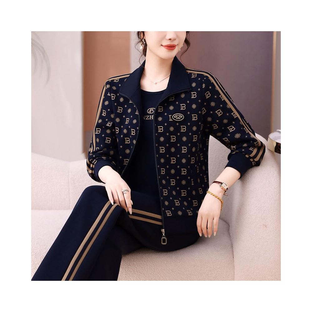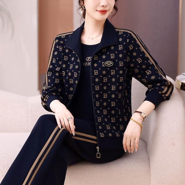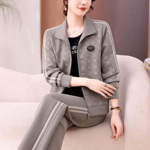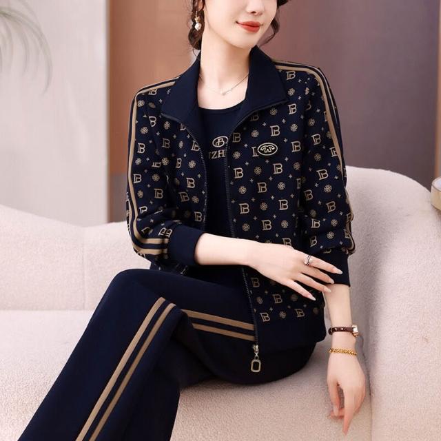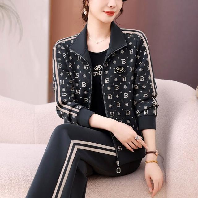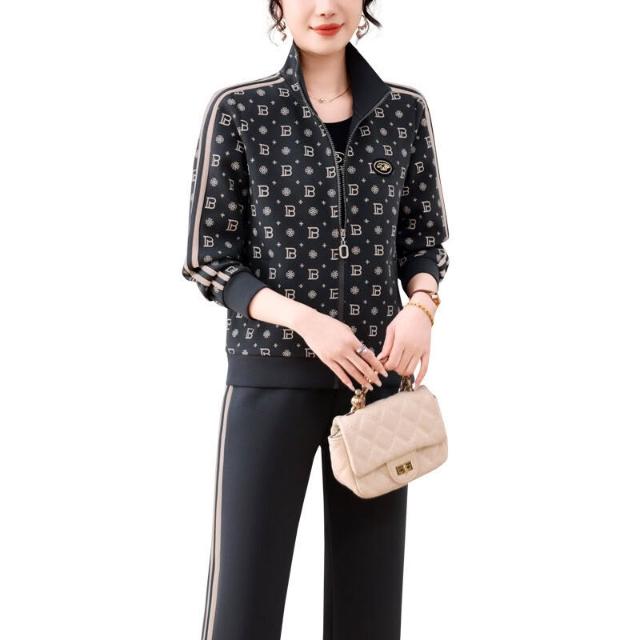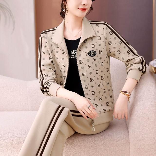 2025年媽媽秋裝外套大碼休閑兩件套中老年長袖印花時尚運動服套裝
