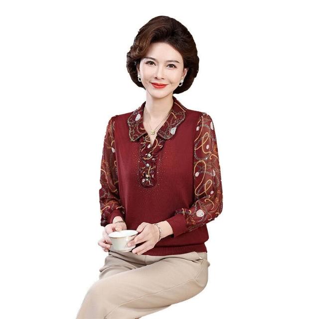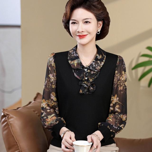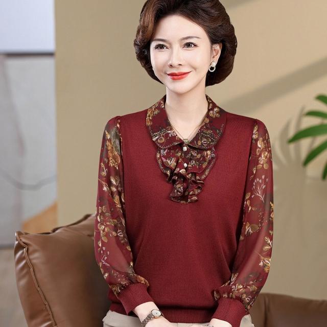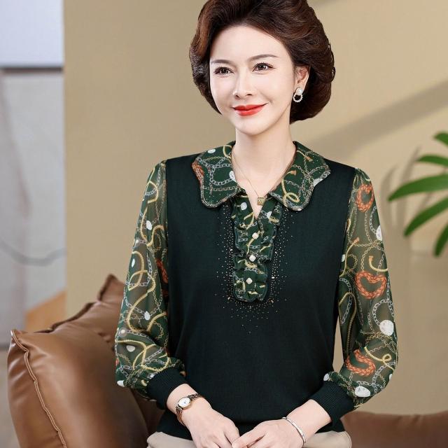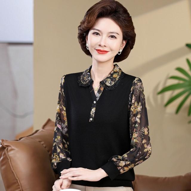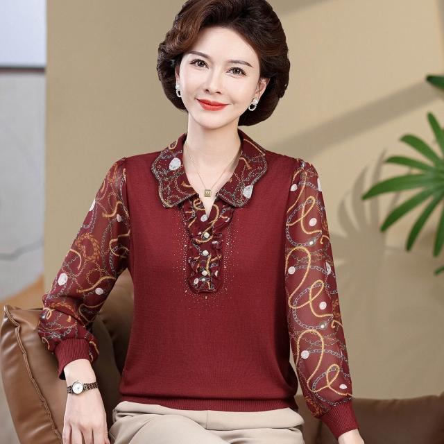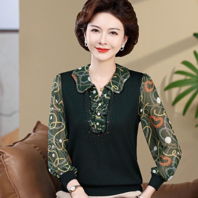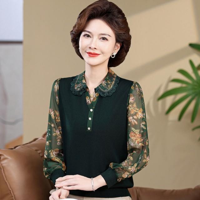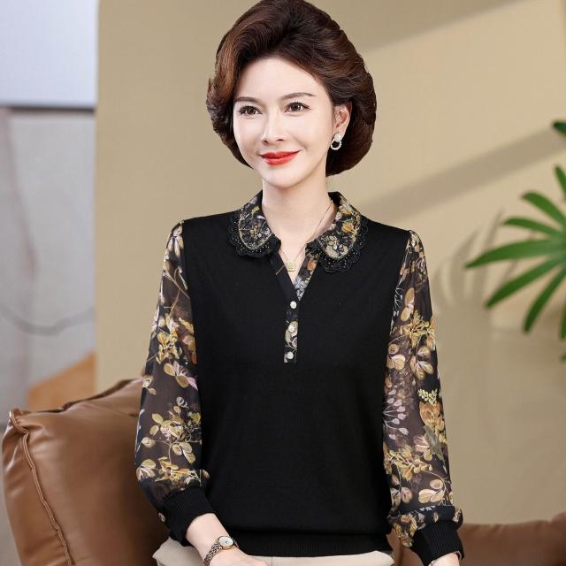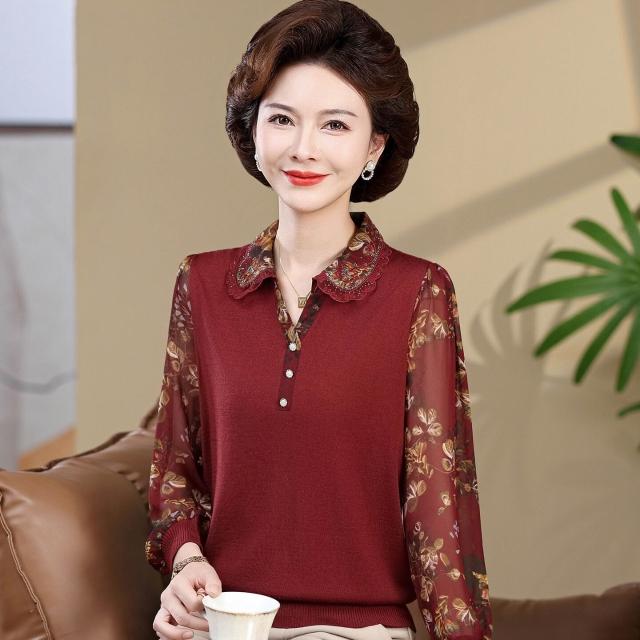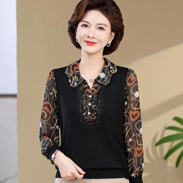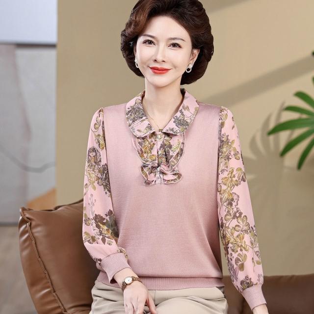 媽媽款上衣服帶領中年女士紗袖T恤小衫洋氣50-60歲老年人春秋長袖