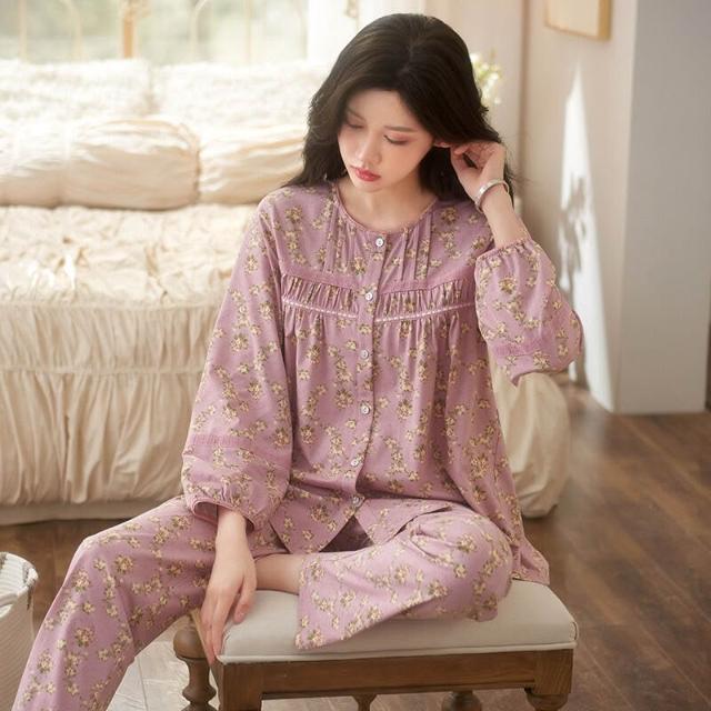 粘纖棉長褲睡衣女款套裝春夏季寬松大碼中年媽媽加肥加大家居服