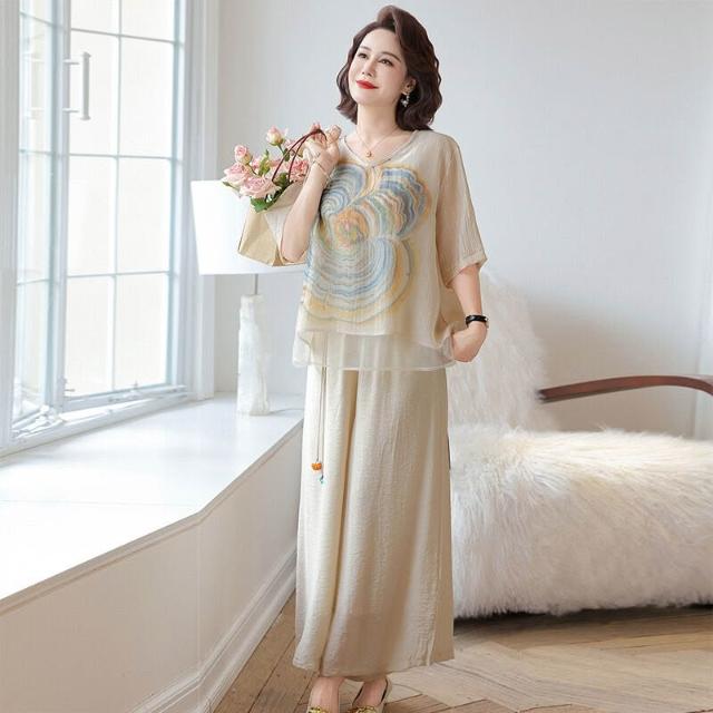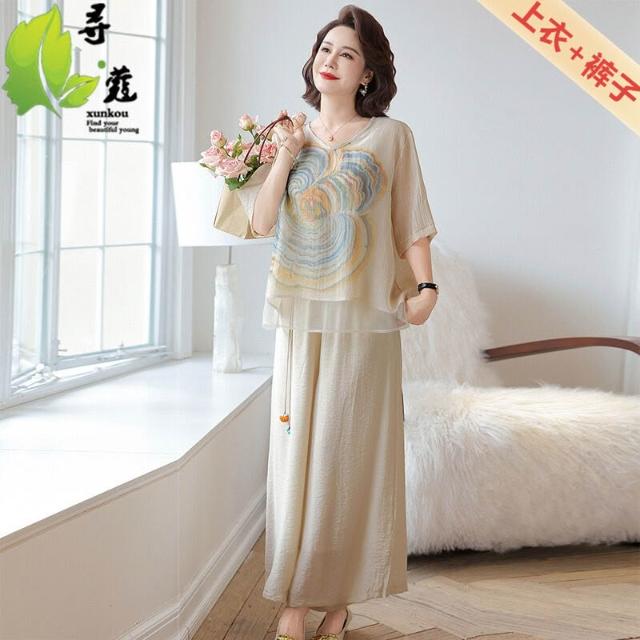 中老年女裝夏季套裝女時尚氣質婆婆裝兩件套中年女士休閑雪紡衣服