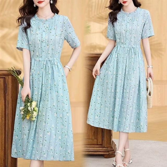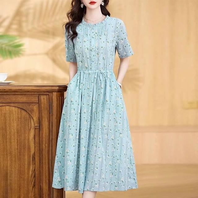 小個子棉麻連衣裙女2025夏季新款感減齡洋氣短袖碎花裙子