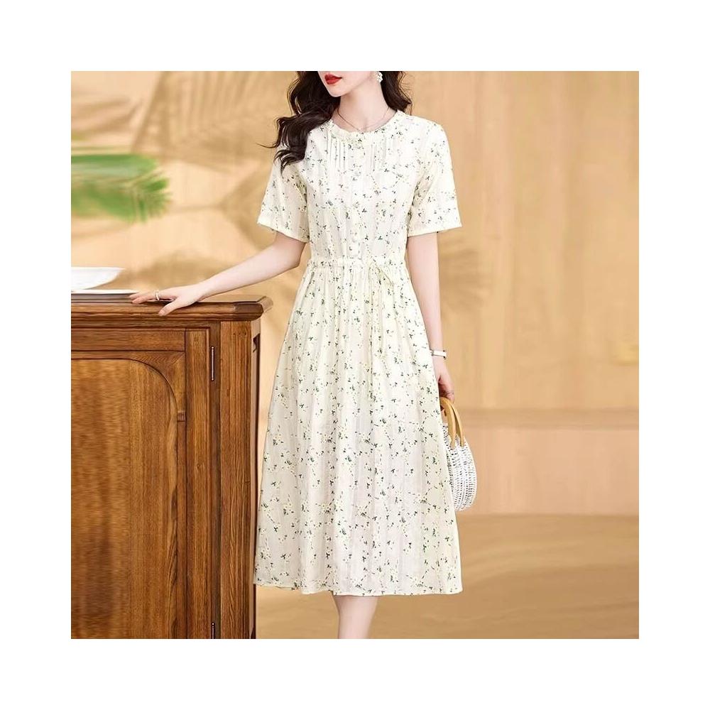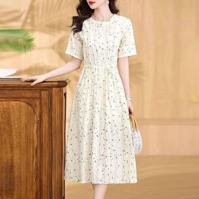 小個子棉麻連衣裙女2025夏季新款感減齡洋氣短袖碎花裙子