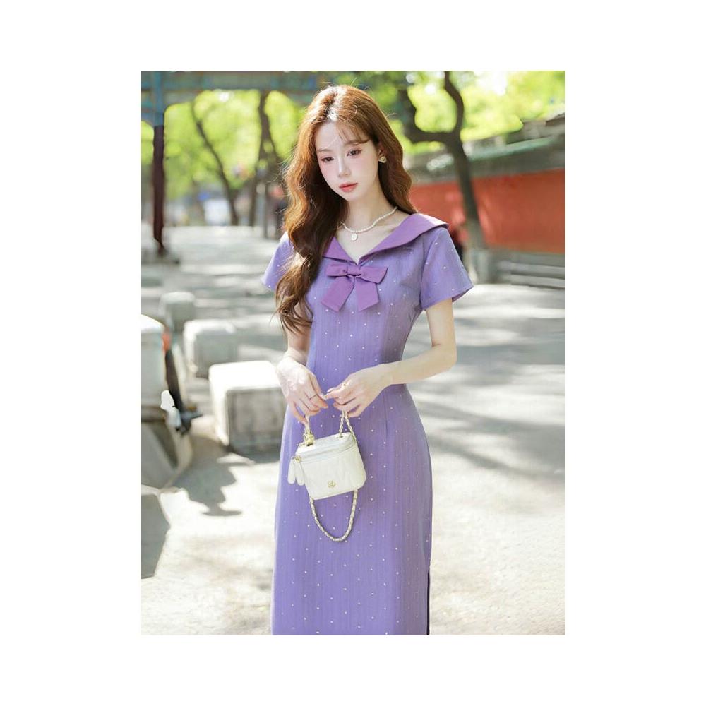 2025年夏日流行穿搭新中式國風連衣裙女學院風氣質收腰顯瘦中長裙