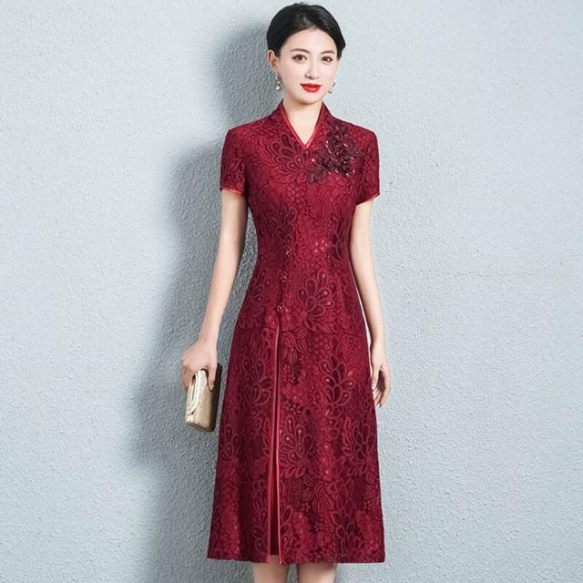 媽媽婚宴禮服夏季蕾絲改良喜婆婆裝旗袍連衣裙9836-1優雅