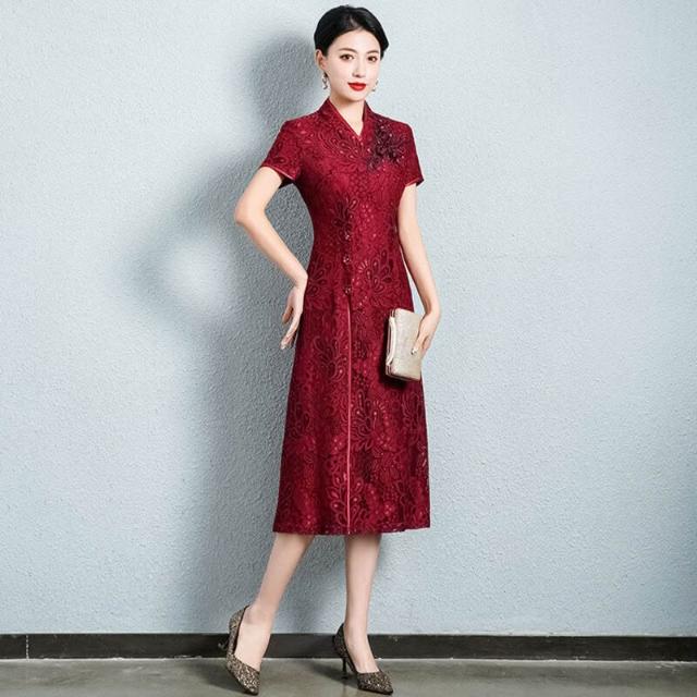 媽媽婚宴禮服夏季蕾絲改良喜婆婆裝旗袍連衣裙9836-1優雅