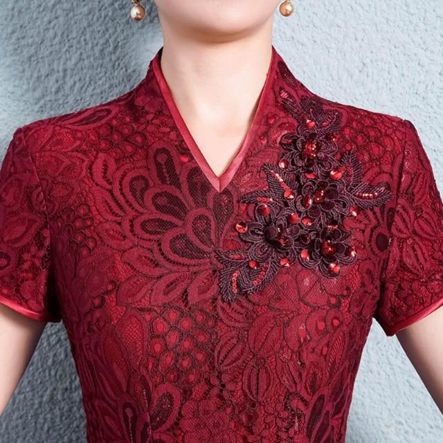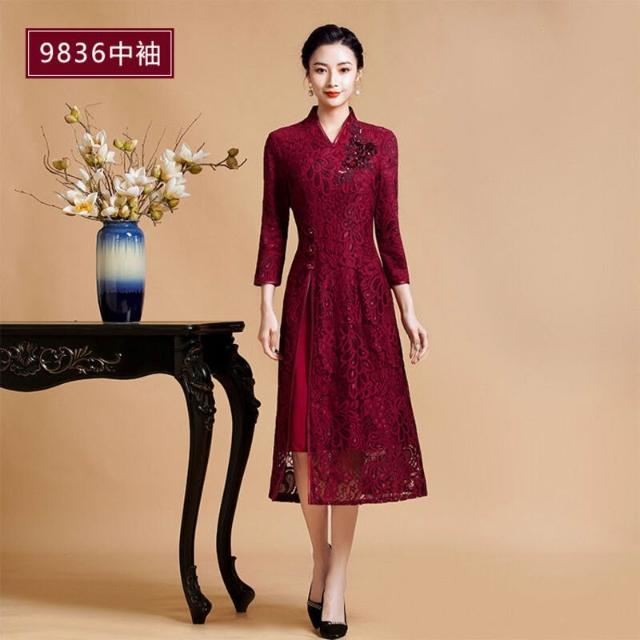 媽媽婚宴禮服夏季蕾絲改良喜婆婆裝旗袍連衣裙9836-1優雅