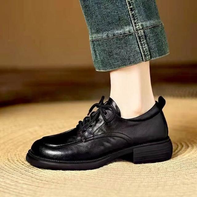 頭層牛皮圓頭系帶樂福鞋女2025秋季新款輕奢手抓紋深口單鞋小皮鞋