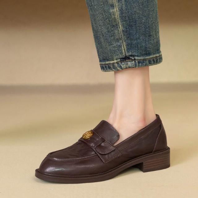 褶皺軟羊皮樂福鞋女2025新款山茶花小皮鞋一腳蹬圓頭低跟單鞋