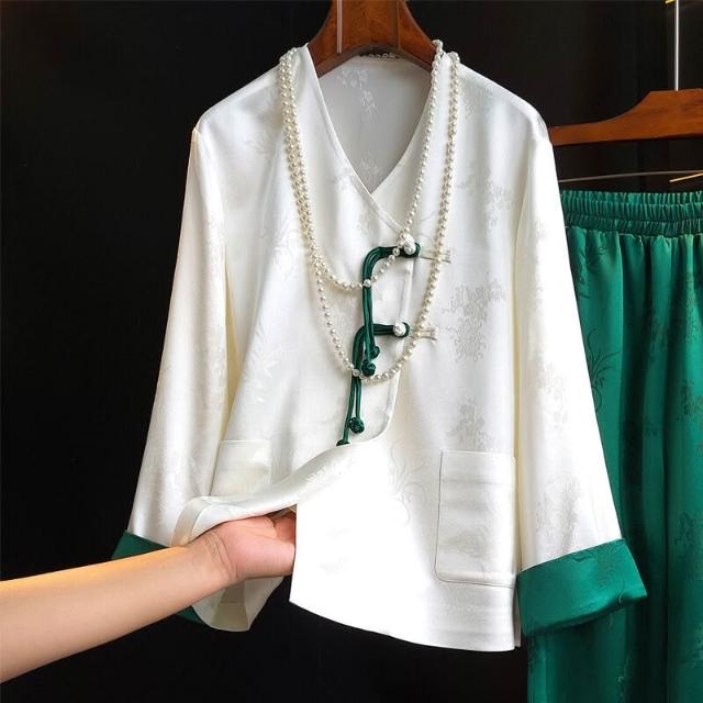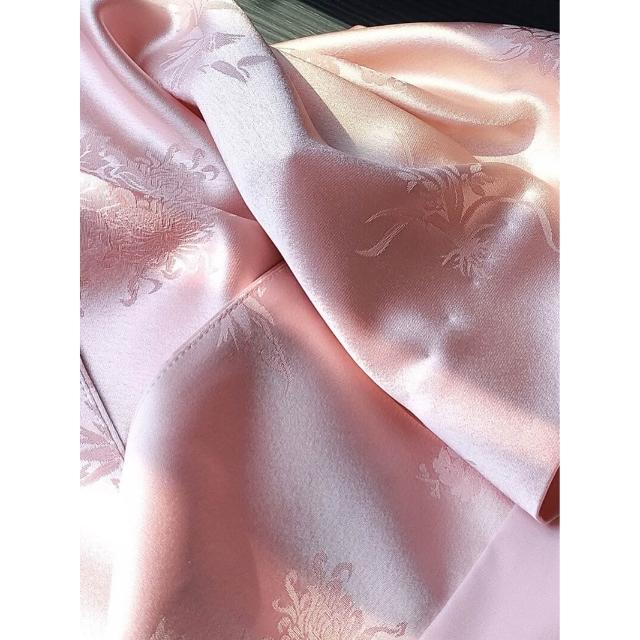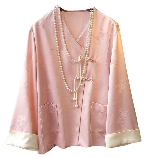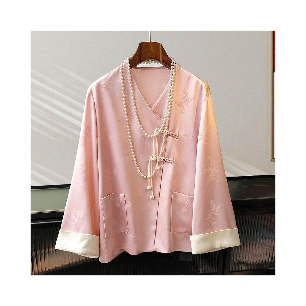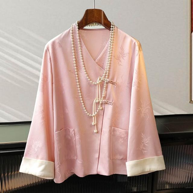 粉色高級感醋酸緞襯衫外套女設計感V領提花國風中式盤扣上衣