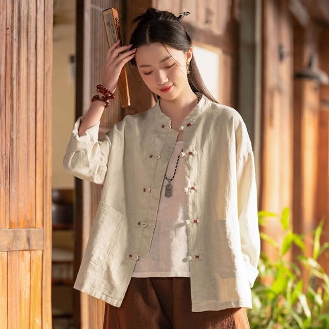 25新中式女裝立領纏線盤扣上衣開衫女式棉麻國風改良唐裝外套