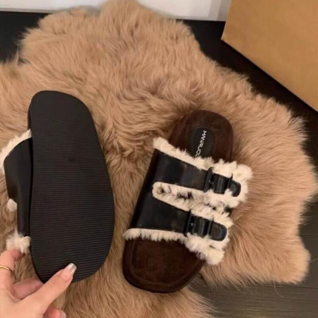 雙扣厚底毛毛拖鞋女鞋子外穿2025年冬新款勃肯棉鞋加絨雪地靴
