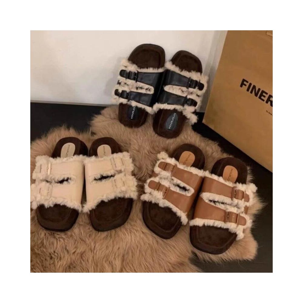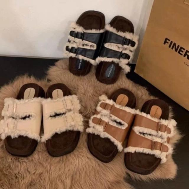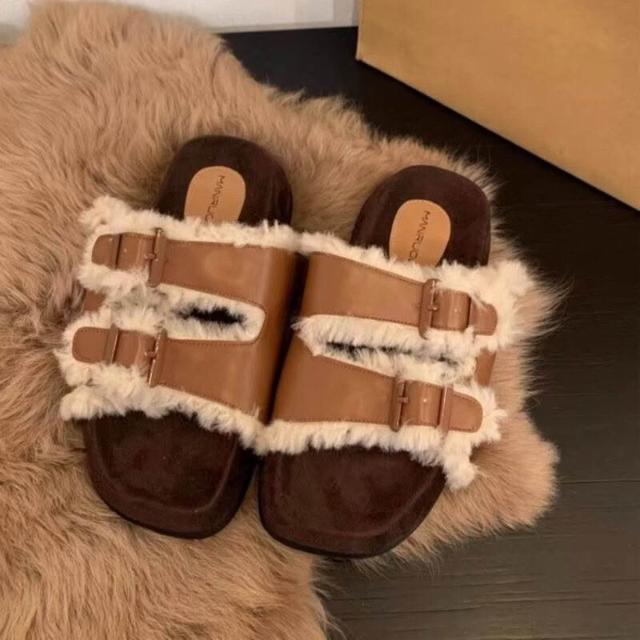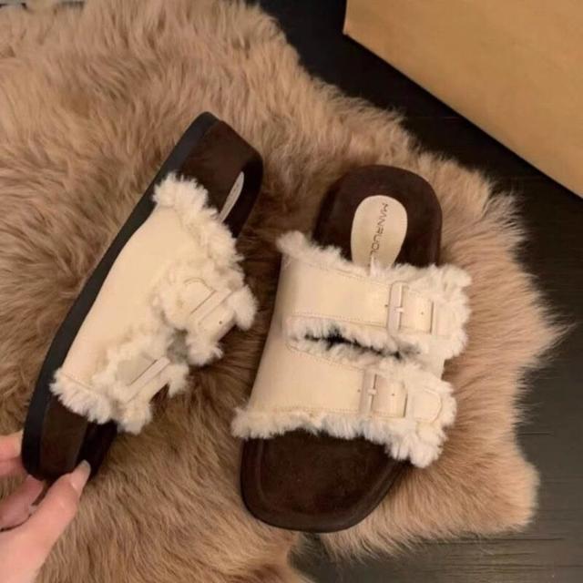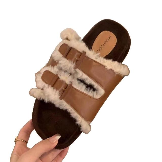 雙扣厚底毛毛拖鞋女鞋子外穿2025年冬新款勃肯棉鞋加絨雪地靴