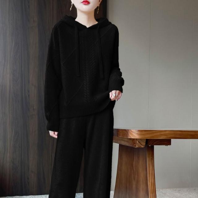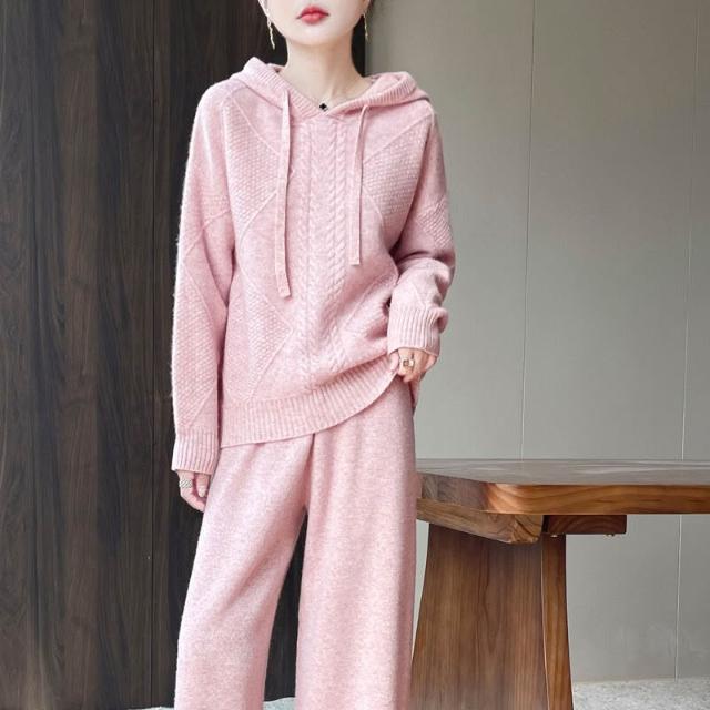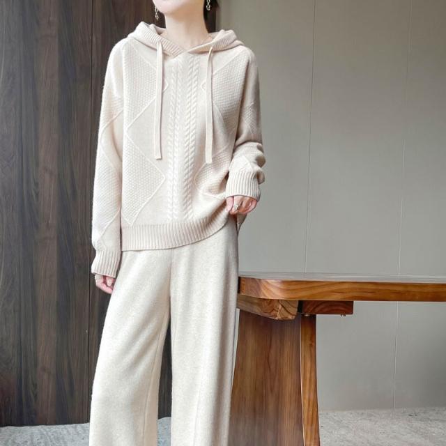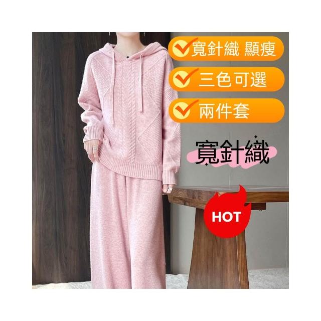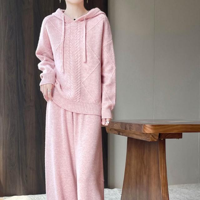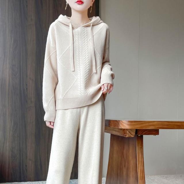 秋冬毛衣 慵懶寬松套裝 連帽純羊毛衛衣 針織衫 女菱形外搭 帽衫闊腿褲兩件套 套裝