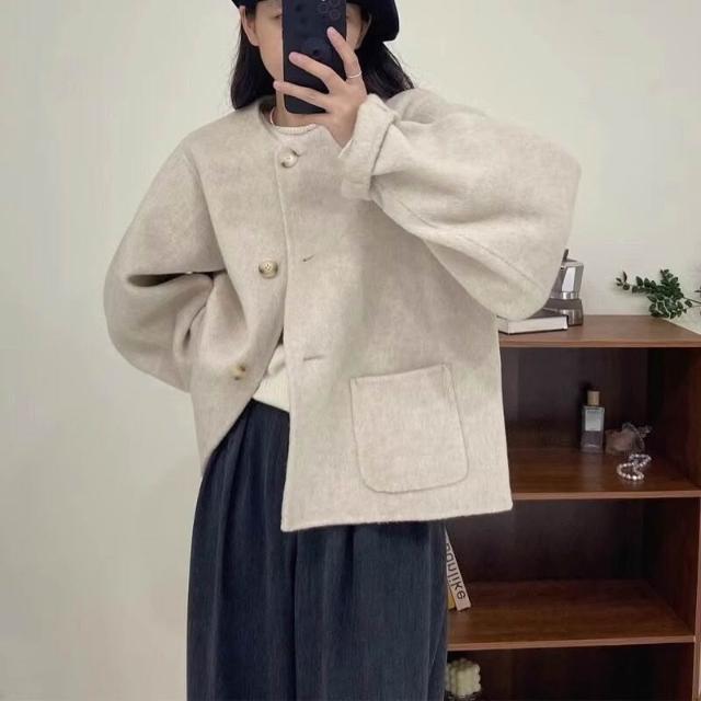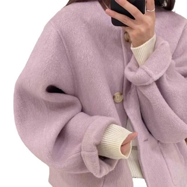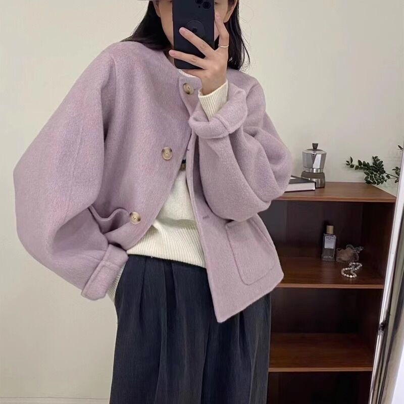 2025秋冬新款雙面羊毛大衣女紫色圓領短款小香風小個子毛呢外套絨