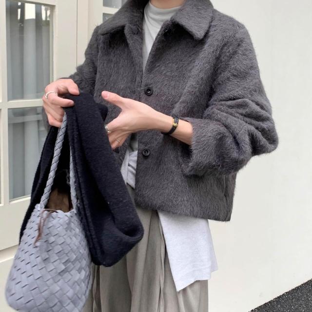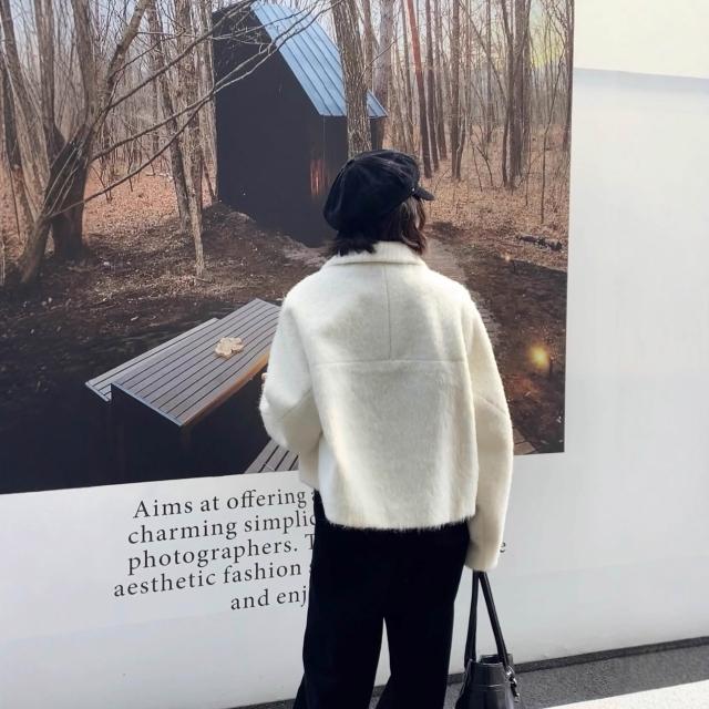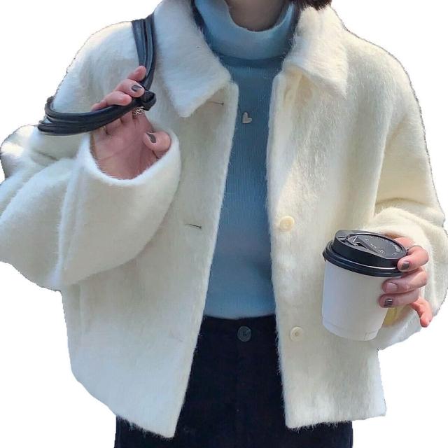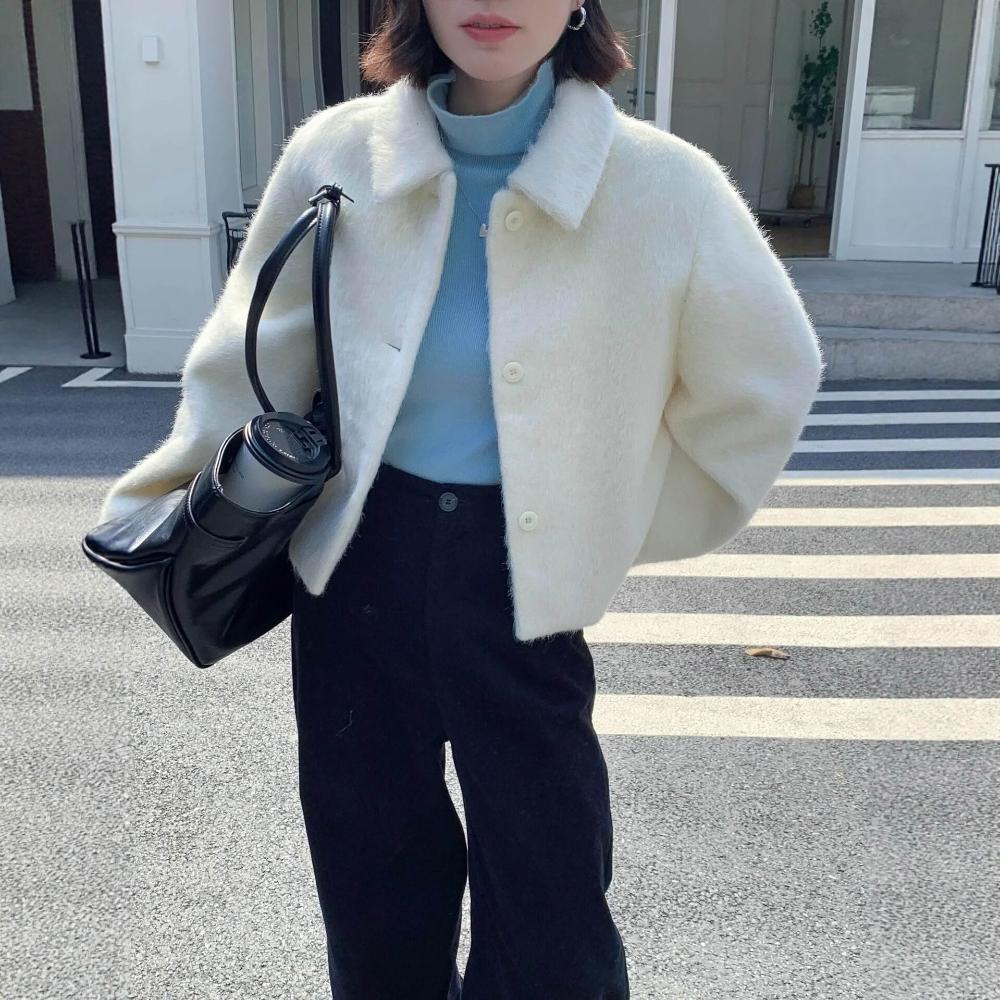 6194韓系秋冬蘇麗羊駝拉毛大衣短款百搭簡約風翻領羊毛呢外套女