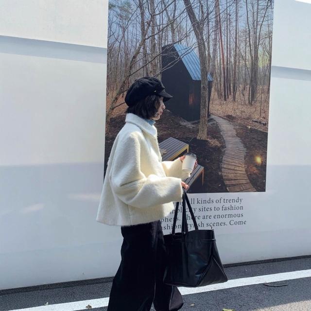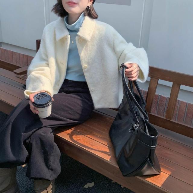 6194韓系秋冬蘇麗羊駝拉毛大衣短款百搭簡約風翻領羊毛呢外套女