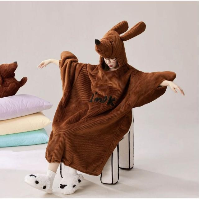 秋冬季小熊貓外穿加絨加厚連帽寬松大睡袍睡裙睡衣保暖長款家居服