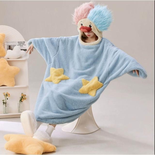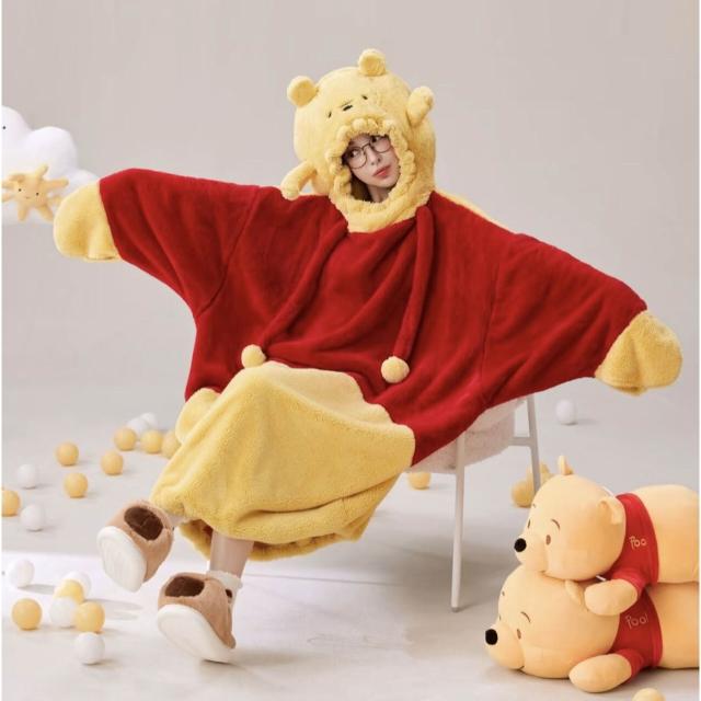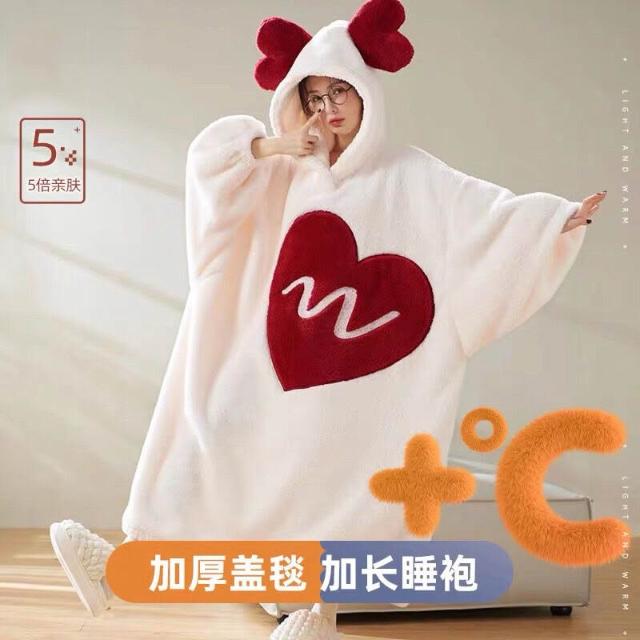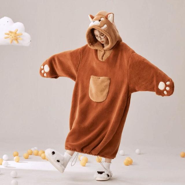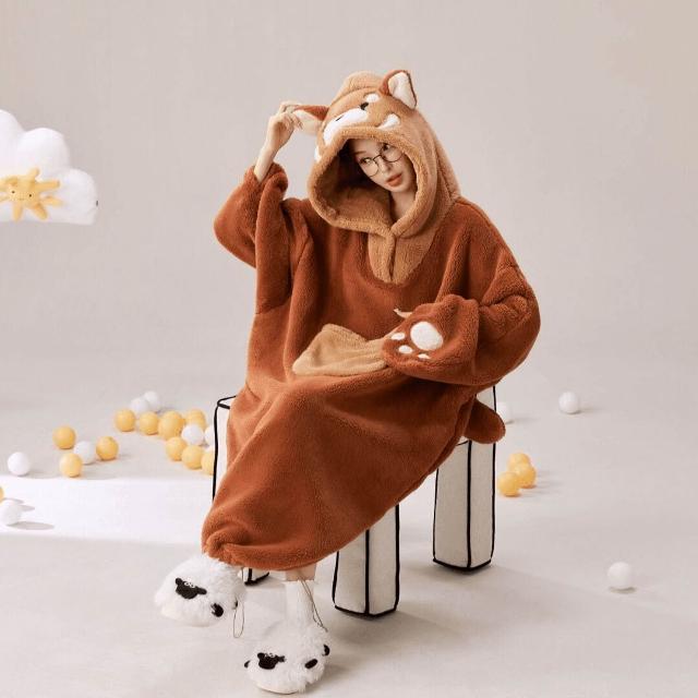 秋冬季小熊貓外穿加絨加厚連帽寬松大睡袍睡裙睡衣保暖長款家居服