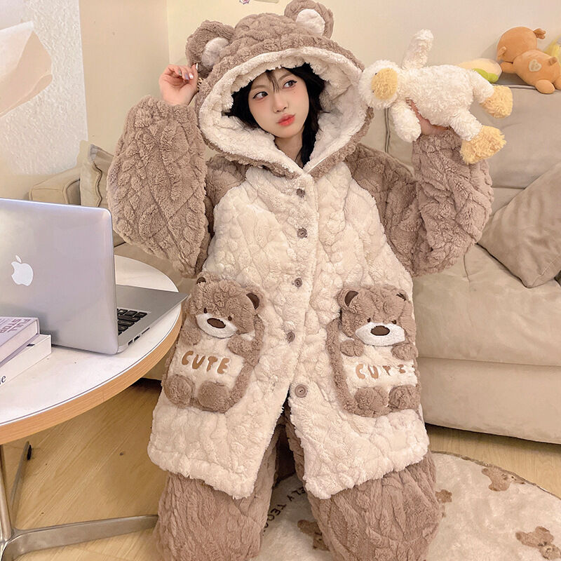 可愛小熊睡衣 睡衣女 連帽保暖居家服 家居服套裝 情侶居家服
