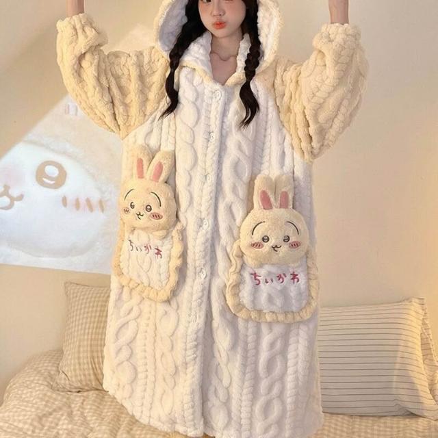 珊瑚絨睡袍冬季加絨加厚chikawa烏薩奇睡衣女款冬天法蘭絨家居服
