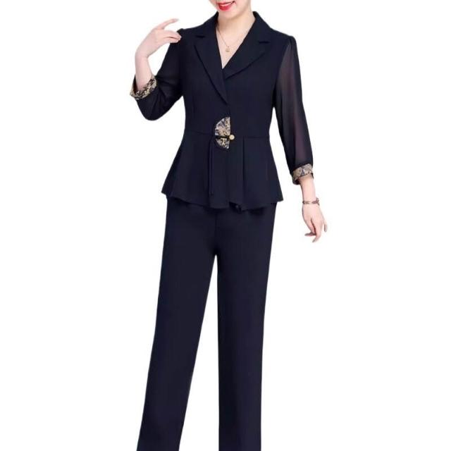 洋氣媽媽新中式西裝兩件套中年女中老年收腰顯瘦雪紡中袖時尚套裝