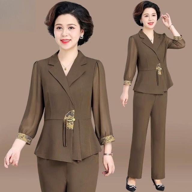 洋氣媽媽新中式西裝兩件套中年女中老年收腰顯瘦雪紡中袖時尚套裝