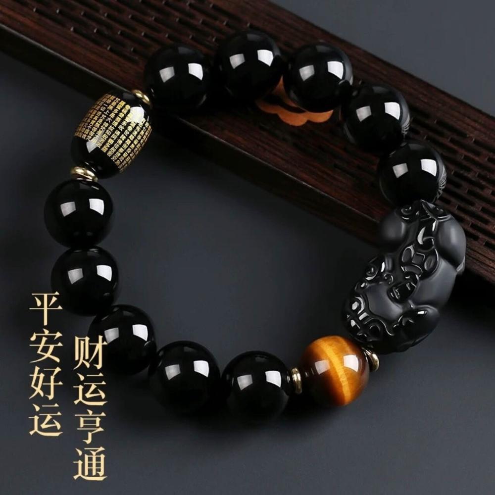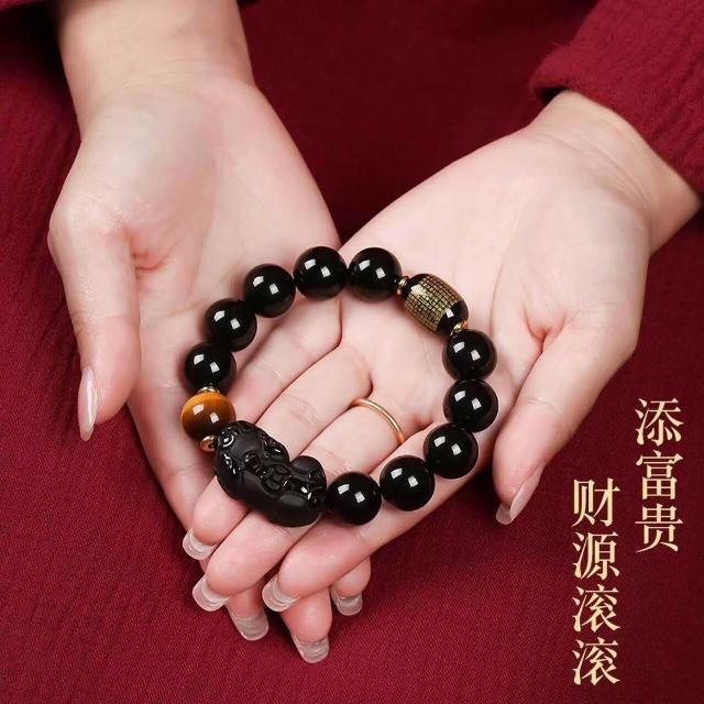 烏金天然黑曜石貔貅招財手串男士串珠轉運珠配珠本命年金曜石手串