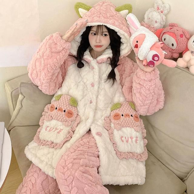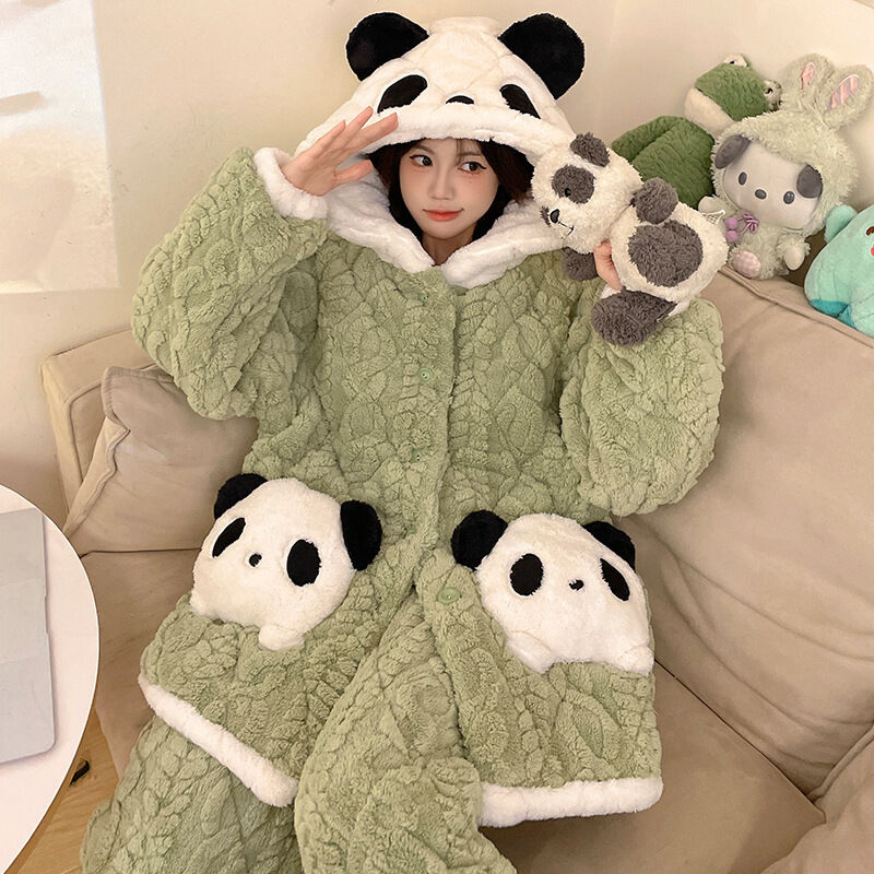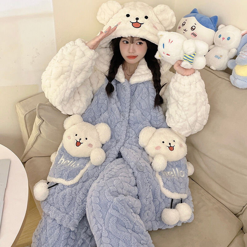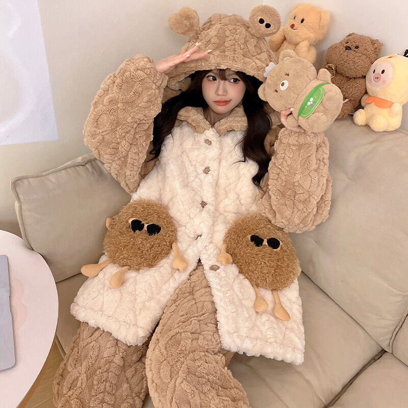 珊瑚絨睡衣女款冬季三層夾棉加厚加絨保暖可愛小熊家居服套裝冬天