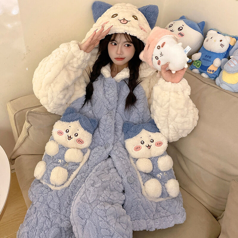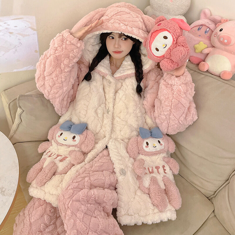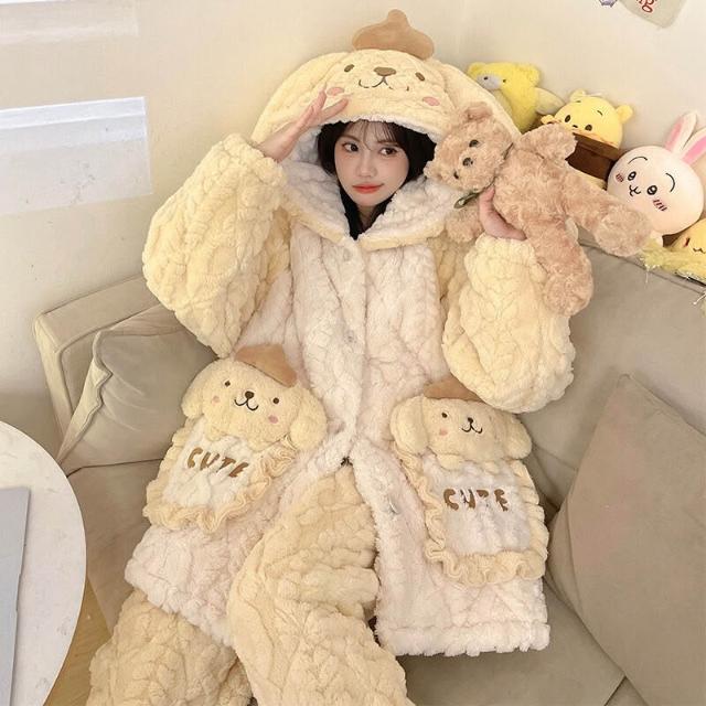 珊瑚絨睡衣女款冬季三層夾棉加厚加絨保暖可愛小熊家居服套裝冬天