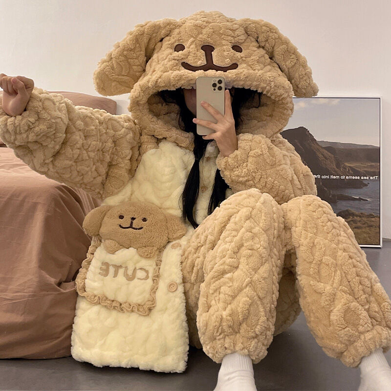 珊瑚絨睡衣女款冬季三層夾棉加厚加絨保暖可愛小熊家居服套裝冬天