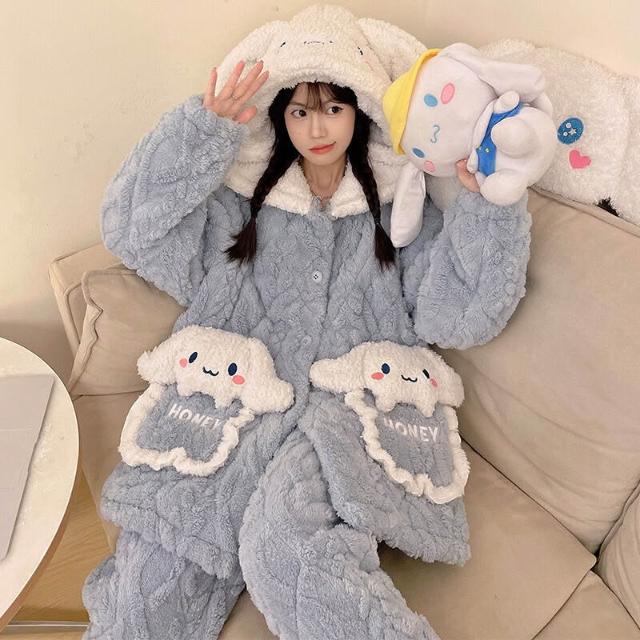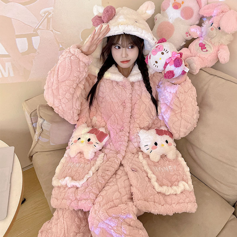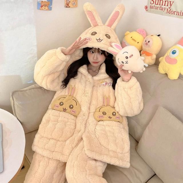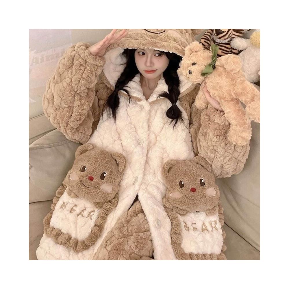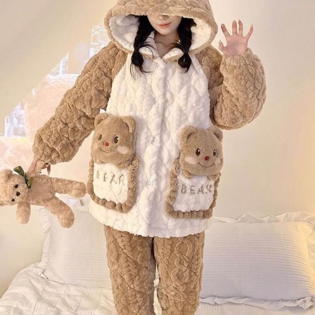 珊瑚絨睡衣女款冬季三層夾棉加厚加絨保暖可愛小熊家居服套裝冬天