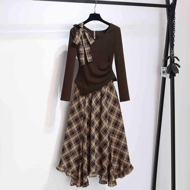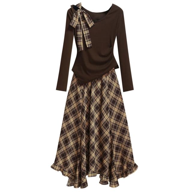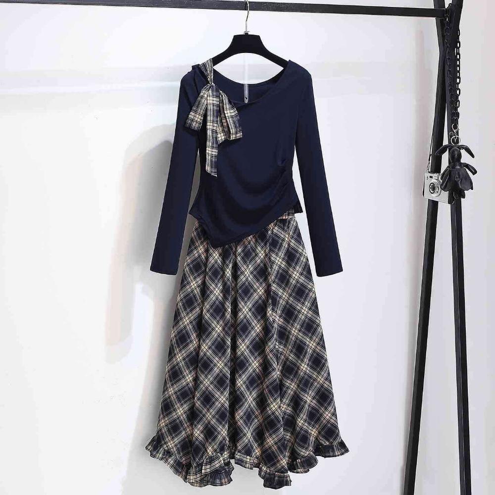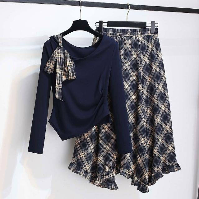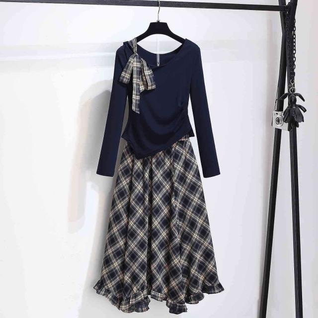 斜肩長袖T恤雪紡格子半身裙薄款女套裝2025秋季新款藏藍色連衣裙