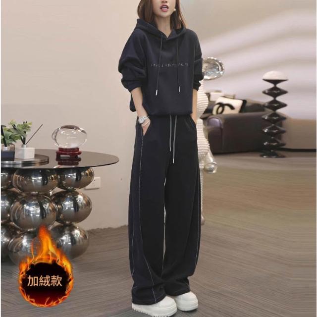 女士時尚減齡闊腿褲套裝 冬季加絨保暖運動套裝 歐貨高級感衛衣闊腿褲 女款休閑減齡兩件套 2026新款加絨運動套裝
