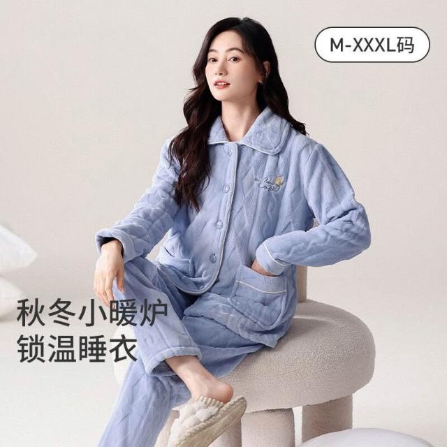 新款珊瑚絨睡衣女秋冬款保暖法蘭絨可外翻領穿女士家居服套裝