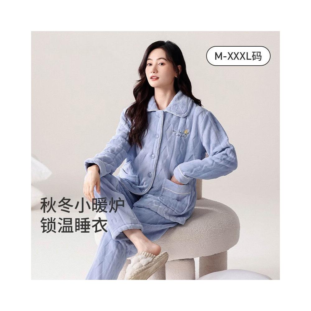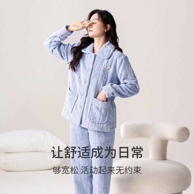 新款珊瑚絨睡衣女秋冬款保暖法蘭絨可外翻領穿女士家居服套裝