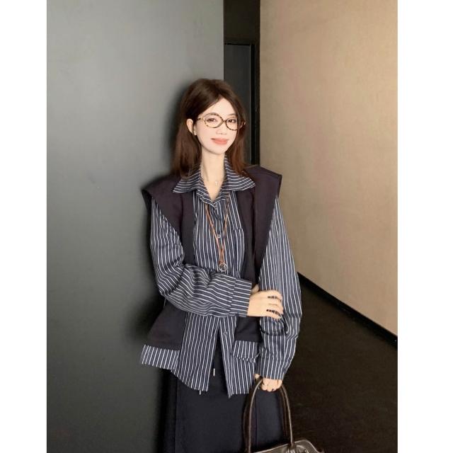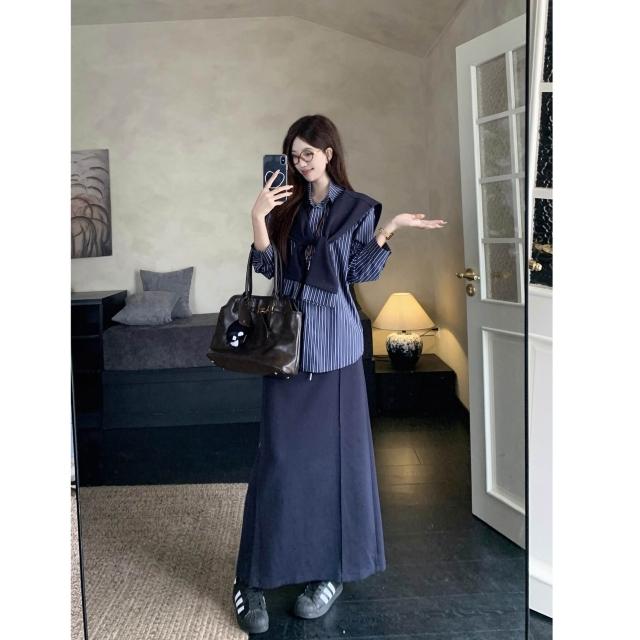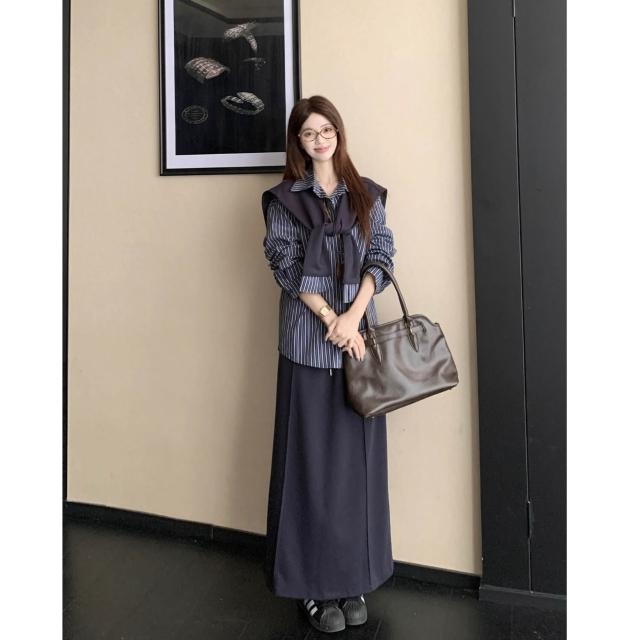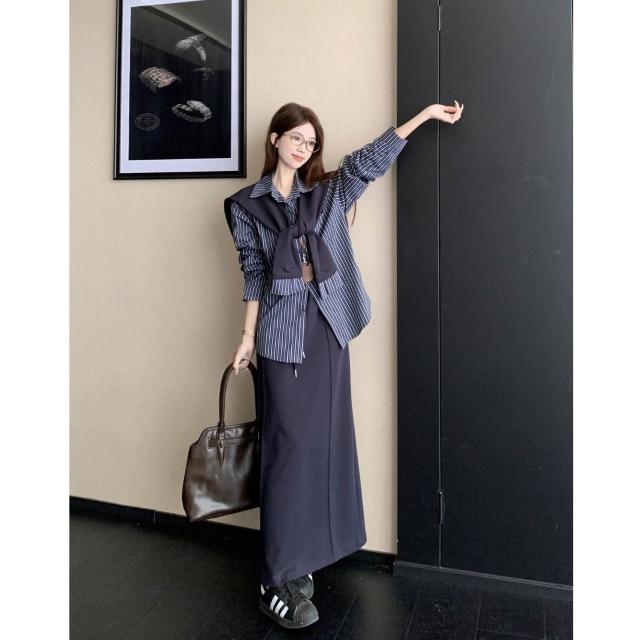 2025秋季新款韓版條紋襯衫三件套秋款加肥半身裙套裝法式氣質女裝