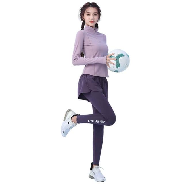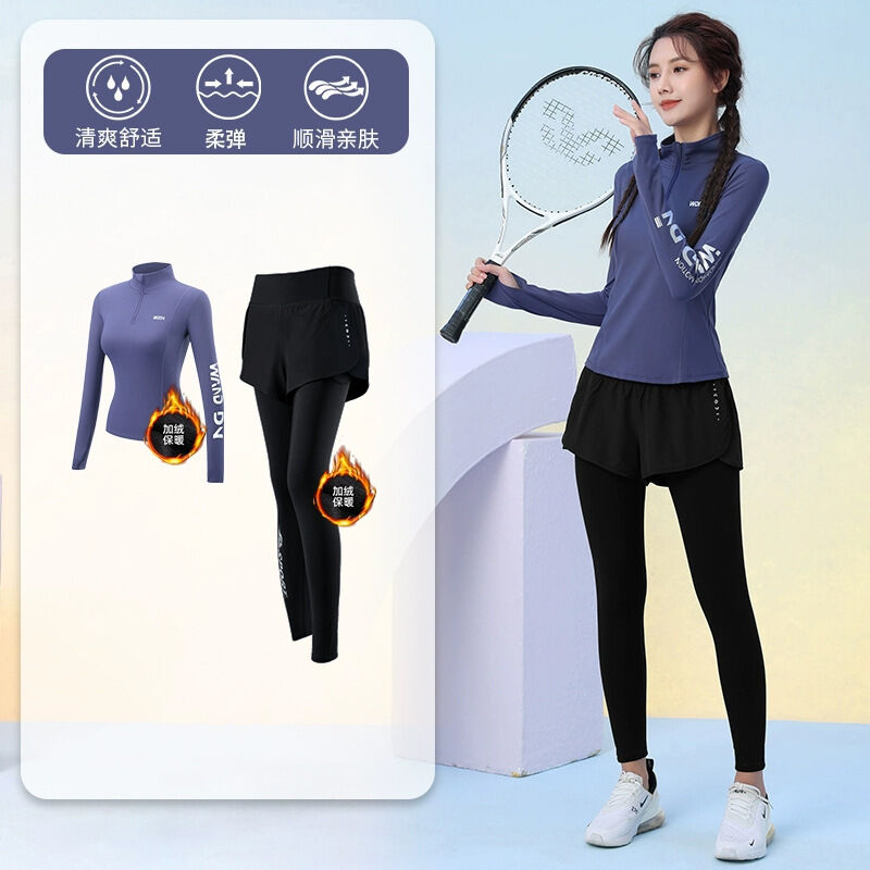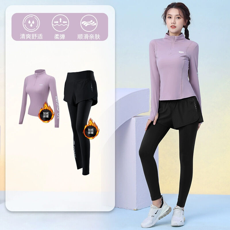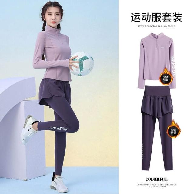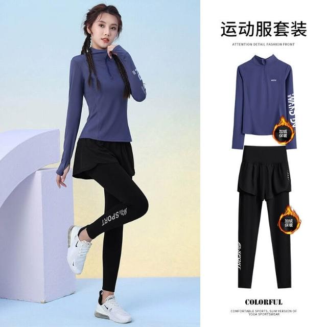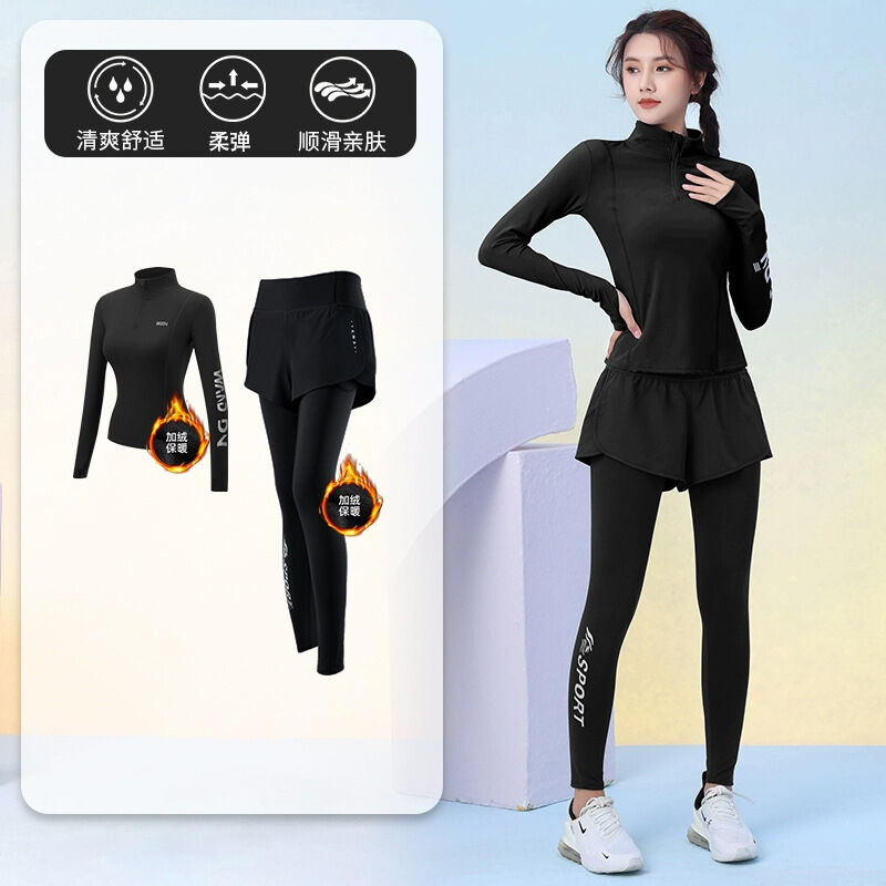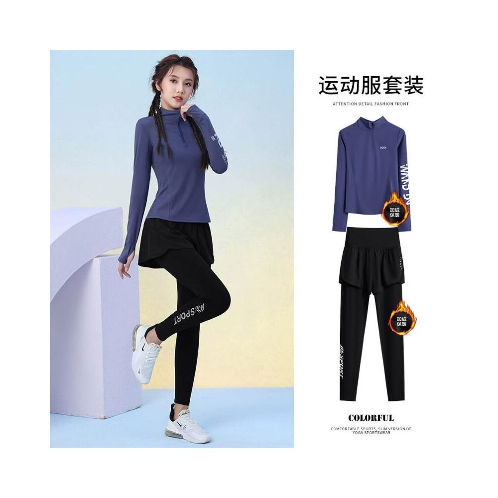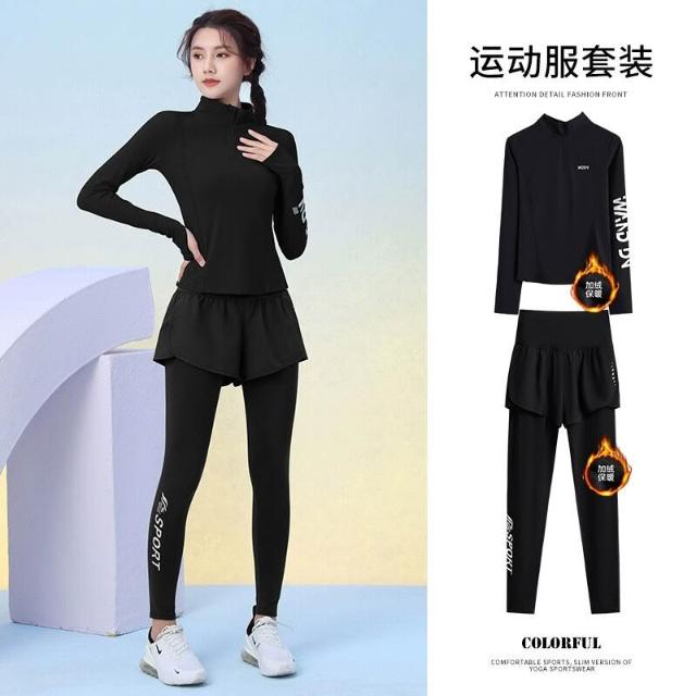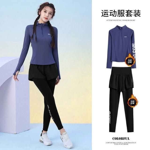 秋冬加絨加厚運動套裝女訓練服保暖健身半拉鏈長袖顯瘦晨跑瑜伽服
