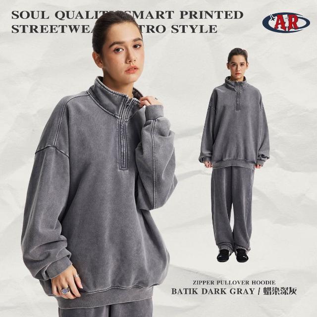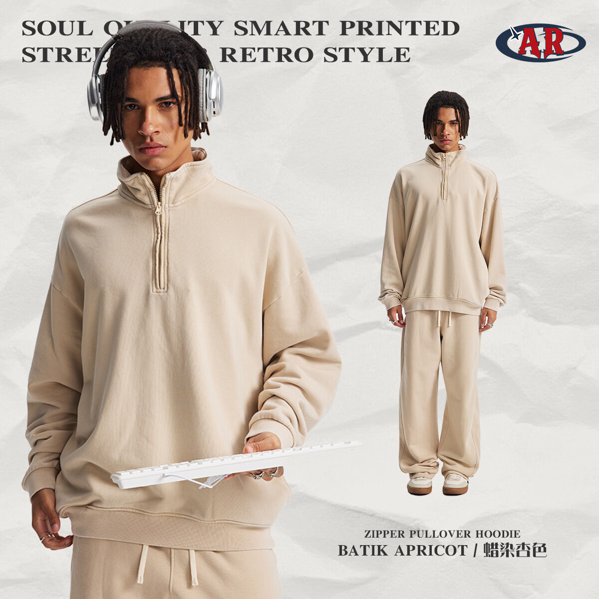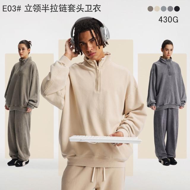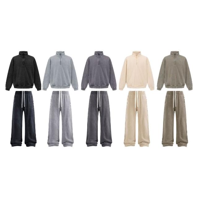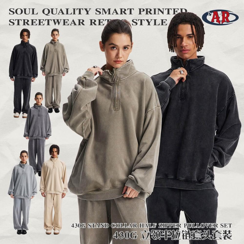 2025秋冬新款做舊復古毛圈立領半拉鏈衛衣套裝寬松潮牌洗水衛衣褲