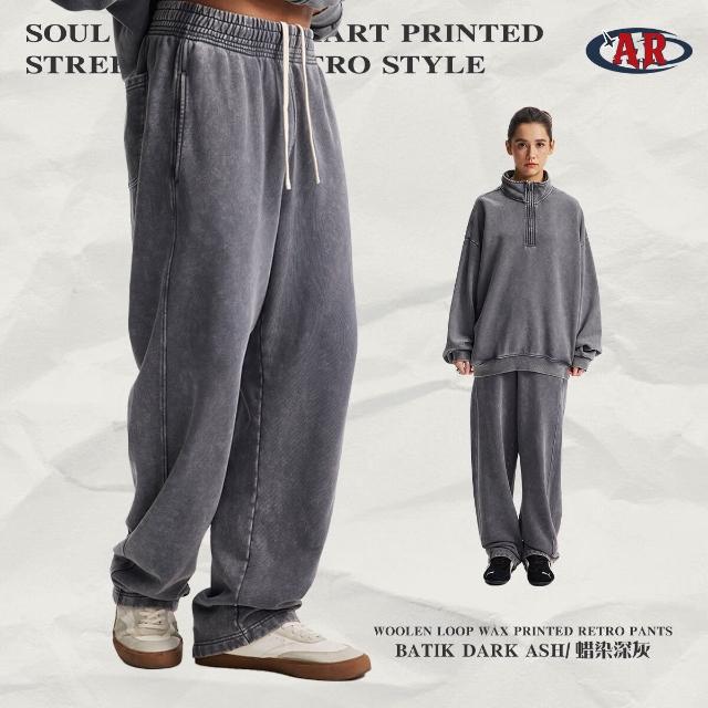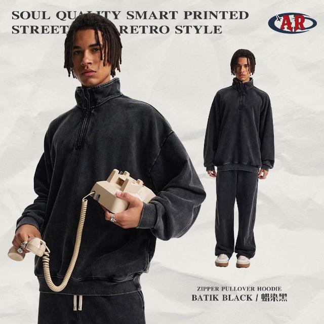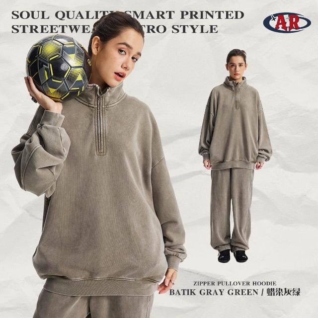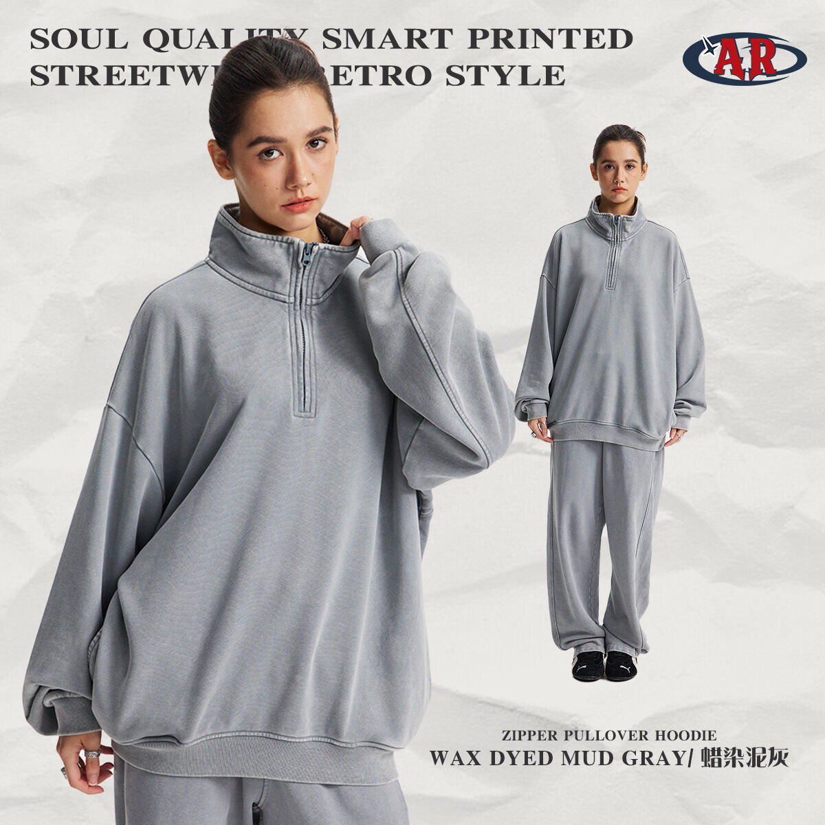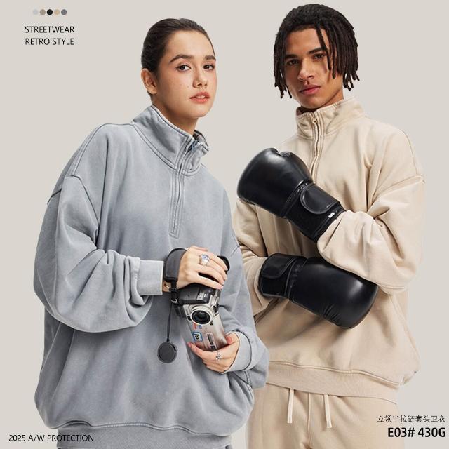 2025秋冬新款做舊復古毛圈立領半拉鏈衛衣套裝寬松潮牌洗水衛衣褲